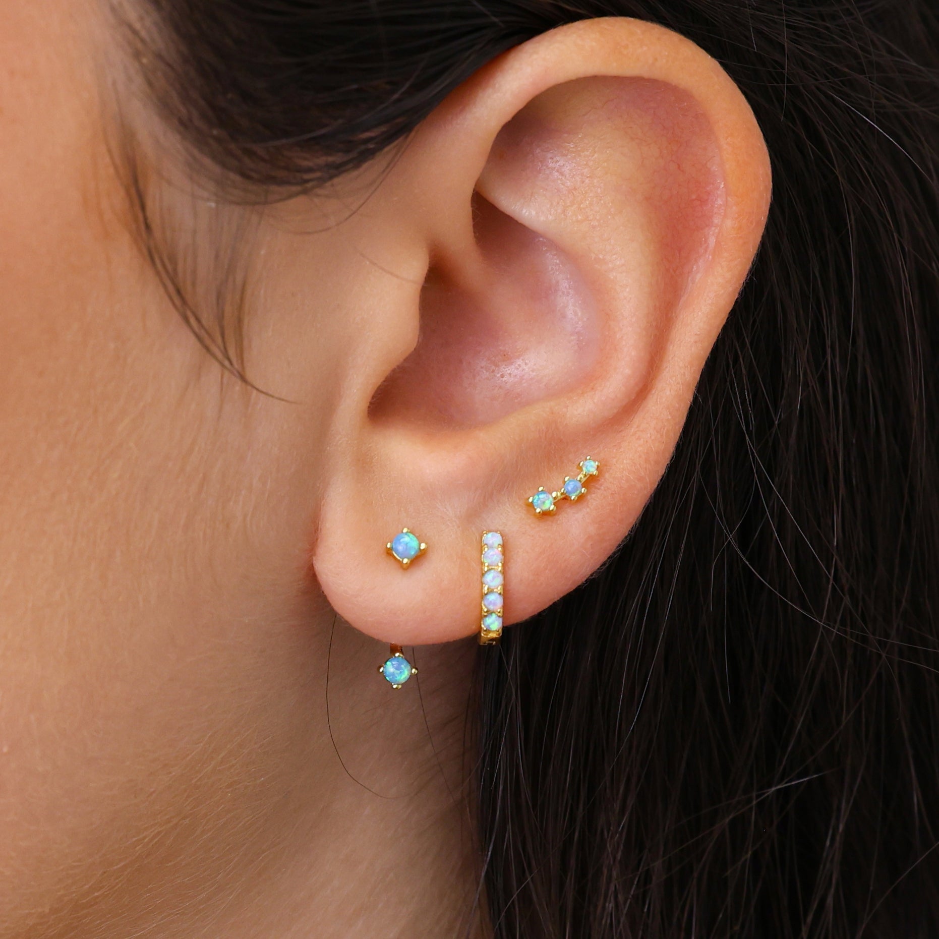Shop our collection of blue opal minimalist earrings, including dainty hoops, studs, and cartilage designs, perfect for ear stacking. Made with 18K Gold Vermeil and .925 Sterling Silver, high quality affordable earrings for all everyday women.