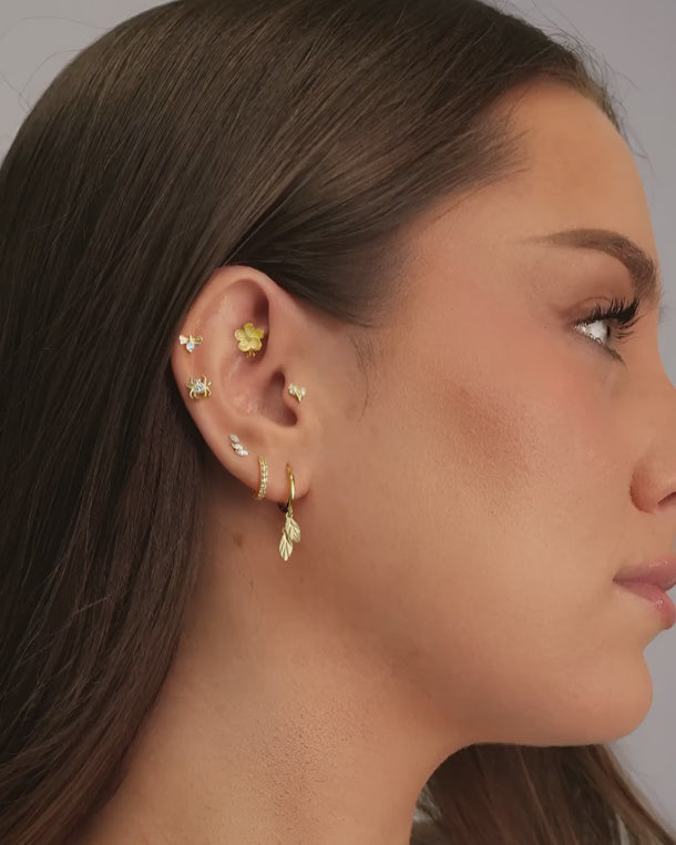 Firefly diamond flat back earrings in 18k gold as helix earrings on model.