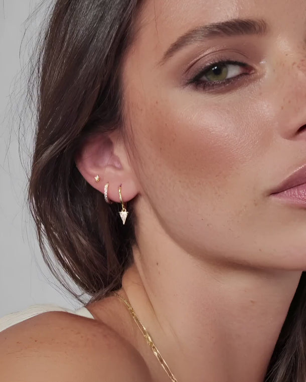 Minimalist and elegant. Our DAPHNE diamond earring sets include delicate studs, paved hoops and diamond charm hoop earrings to give a classic touch. Crafted in gold vermeil or 925 sterling silver, the April birthstone Diamond earring set is for every April birthday women everyday wear. Wear it with confidence, knowing that the DAPHNE diamond earring set will elevate your look with its timeless allure and refined elegance.
