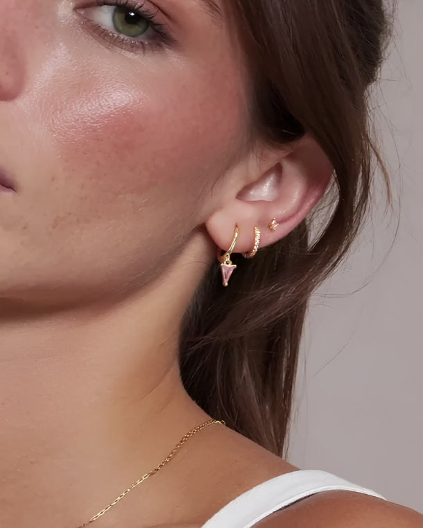 Minimalist and elegant. Our DAPHNE pink tourmaline earring sets include delicate studs, paved hoops and pink tourmaline charm hoop earrings to give a classic touch. Crafted in gold vermeil or 925 sterling silver, the October birthstone Pink Tourmaline earring set is for every October birthday women everyday wear. Wear it with confidence, knowing that the DAPHNE pink tourmaline earring set will elevate your look with its timeless allure and refined elegance.